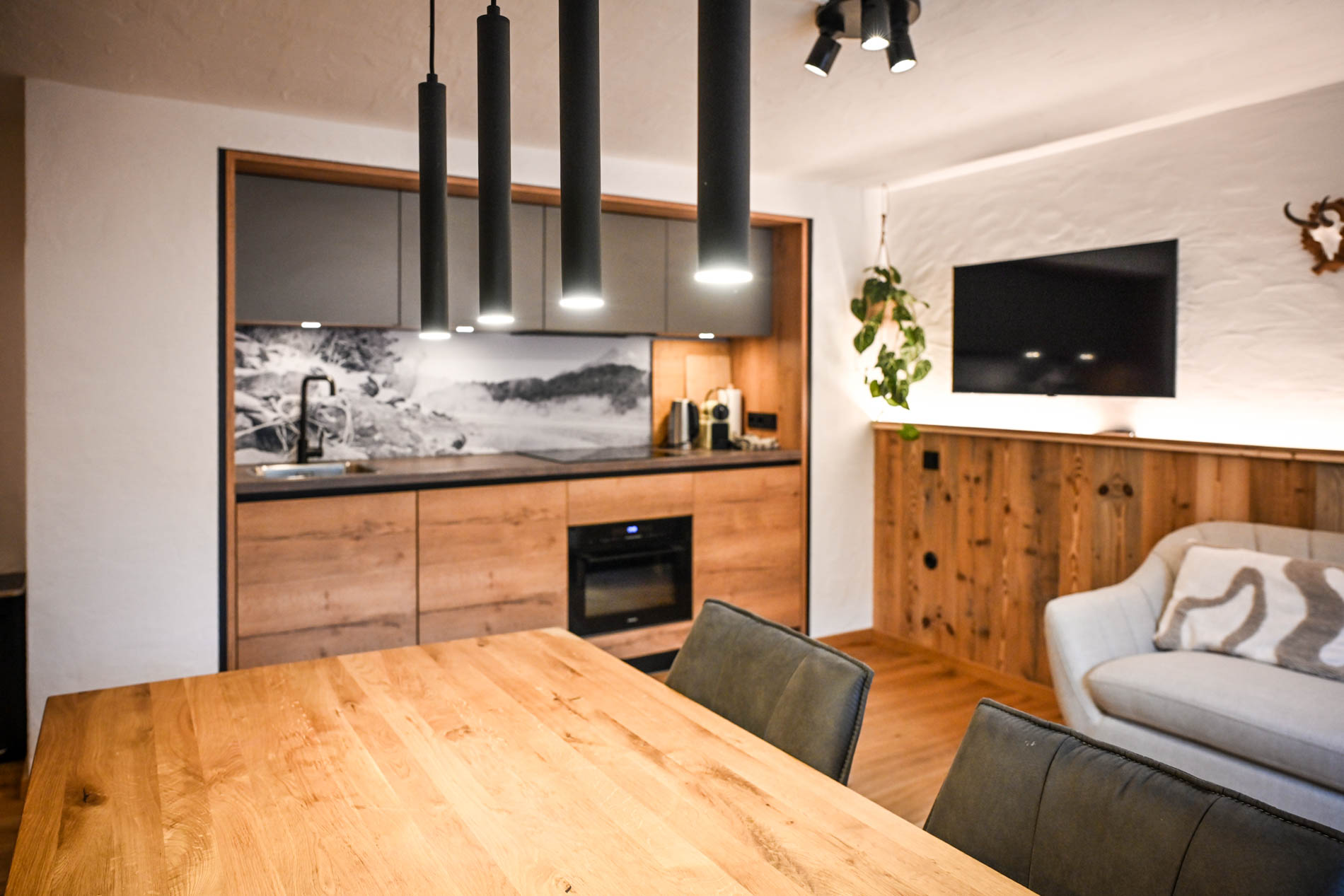 Gemütliches Wohnzimmer in der Wohnküche, mit großer Kuschelcouch. Geschmackvoll eingerichtet mit Flat-TV.